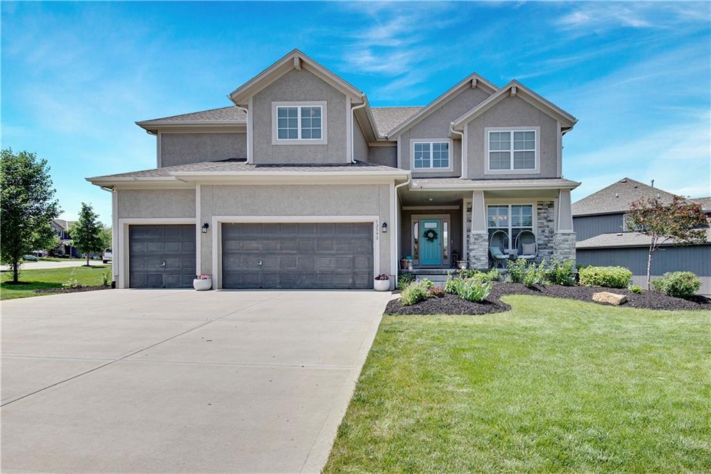 Classically designed two-story home greets all with a large front porch. Main level features sun-filled, open floor plan with hardwood floors, native stone fireplace with built-ins, formal dining room and excellent flow for entertaining. Huge kitchen features large eat-in island with honed-finish granite, loads of cabinetry, stainless appliances plus spacious built-in pantry and breakfast area. Convenient main floor bedroom with full bathroom is perfect for guests or a home office. Second floor features loft play area, three secondary bedrooms with walk-in closets plus two full bathrooms. Laundry opens to upper hallway and master suite and has built-in cabinet storage, folding counter and hanging space. Master bedroom is spacious with ample space for sitting area or office. Master bathroom has neutral tile, tall vanities, jetted tub, walk-in shower plus wonderful walk-in closet. Storage space abounds with three car garage and unfinished basement. Enjoy the spacious lot with covered patio plus plenty of room for a garden or play set. Fantastic neighborhood amenities with pool, splash ground, sand volleyball, play area and located directly across from Clare Road Trailhead for Cedar Niles Trail. Excellent location and close to everything! Quick access to area schools, highways, restaurants, shopping and golf courses. Award winning Olathe School District offers bountiful programs and resources for students and families.